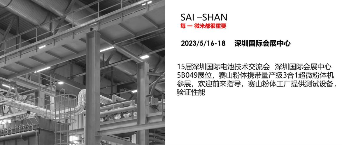 15屆深圳國際電池技術交流會 深圳國際會展中心5B049展位,賽山粉體攜帶量產級3合1超微粉體機參展,歡迎前來指導,賽山粉體工廠提供測試設備,驗證性能,,在以上設備集成了賽山粉碎的比較新功能單元,歡迎新老客戶光臨展臺。