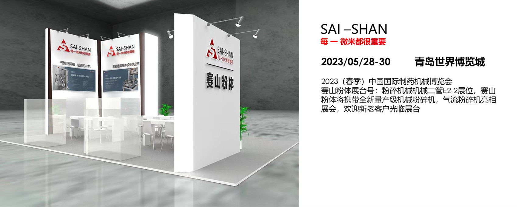 2023(春季)中國國際制藥機械博覽會,賽山粉體展臺號:粉碎機械機械二管E2-2展位,賽山粉體將攜帶全新量產級機械粉碎機,氣流粉碎機亮相展會,在以上設備集成了賽山粉碎的比較新功能單元,歡迎新老客戶光臨展臺。