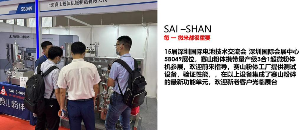 15屆深圳國際電池技術交流會 深圳國際會展中心5B049展位,賽山粉體攜帶量產級3合1超微粉體機參展,賽山粉體工廠提供測試設備,驗證性能,在以上設備集成了賽山粉碎的比較新功能單元。