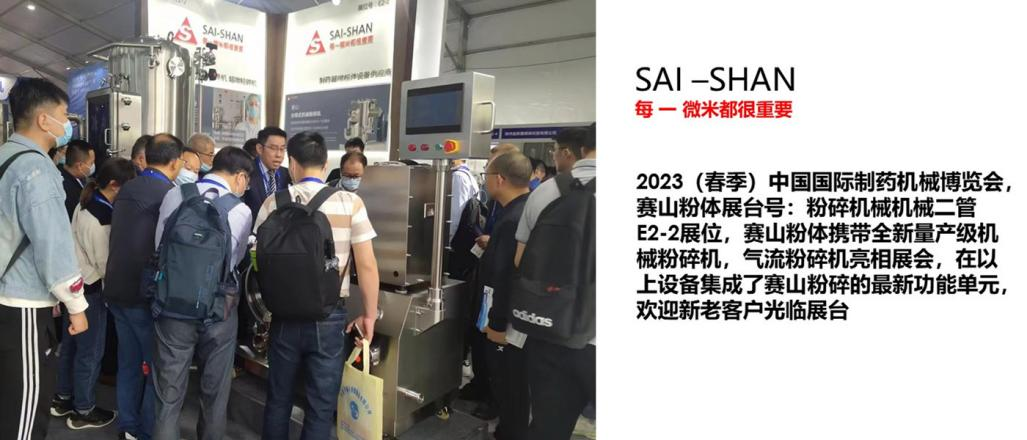 2023(春季)中國國際制藥機械博覽會,賽山粉體展臺號:粉碎機械機械二管E2-2展位,賽山粉體攜帶全新量產(chǎn)級機械粉碎機,氣流粉碎機亮相展會,在以上設(shè)備集成了賽山粉碎的比較新功能單元。